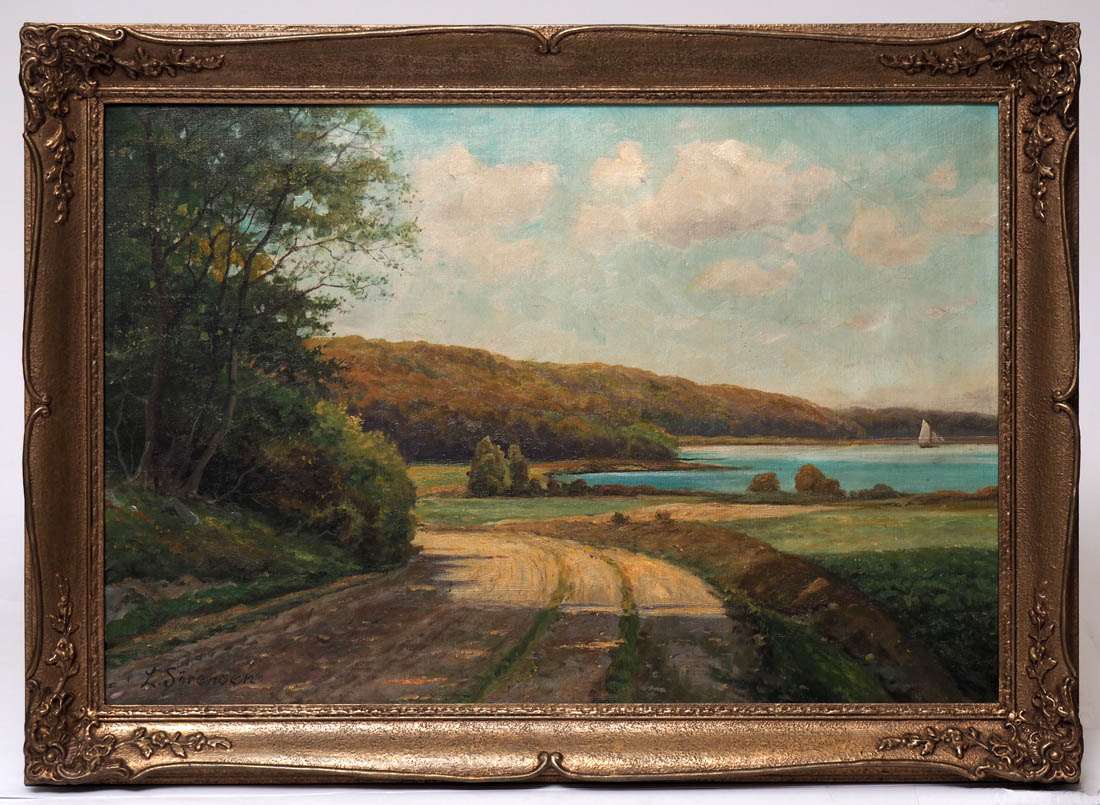 Roadway in wide landscape, in the background a lake at the foot of the wooded hills