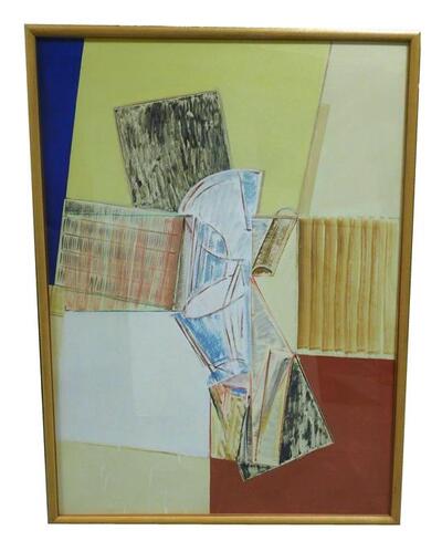 abstract composition depicting painterly geometric forms juxtaposed with unmodulated fields of blue, yellow, red and white, Redfern Gallery (London) label verso with artist information, framed behind glass, expected minor wear, not examined out of fr | |
