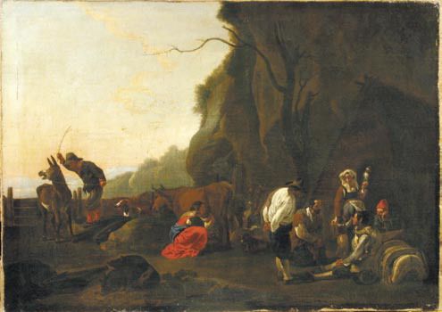 Halte de bergers et leur troupeau dans un paysage rocheux
