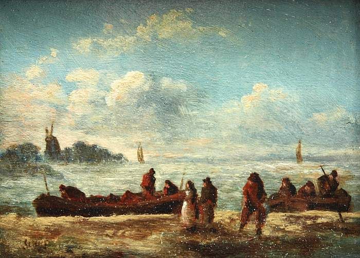 | Fischerboote am Strand. Reiche Personenstaffage, im Hintergrund Blick auf eine Windmühle. | |