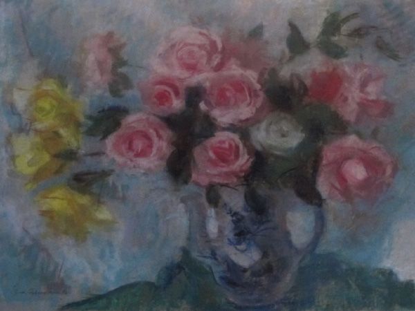 MIXED ROSES IN A BLUE AND WHITE JUG