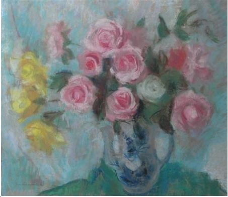 ROSES IN A BLUE AND WHITE VASE