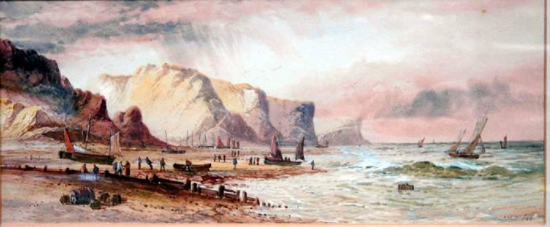 Sailing boats beached below cliffs