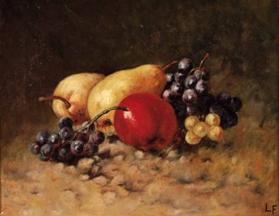 Stillleben mit Weintrauben, Birnen und Apfel