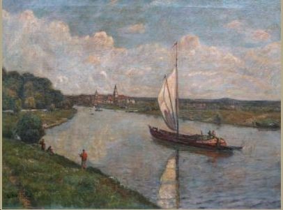 Flusslandschaft mit Stadtsilhouette am Horizont