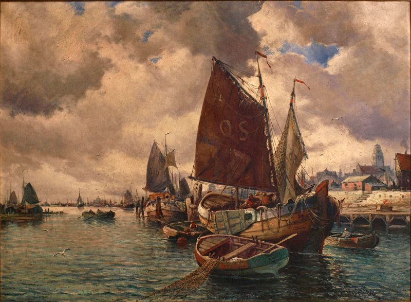 | Hafen einer Küstenstadt mit zahlreichen Segel- und Ruderbooten mit Figurenstaffage unter gewittrigem Himmel | |