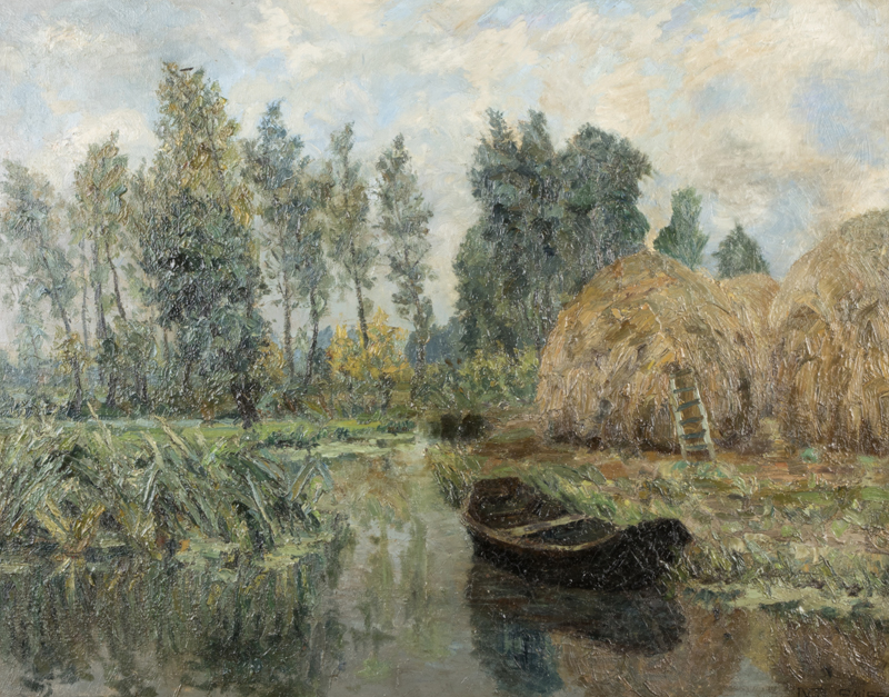 Boat along a bank with haystacks