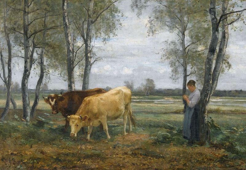 Strickende Bäuerin mit zwei Kühen.