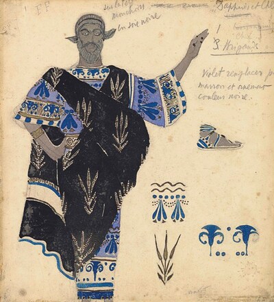 signed 'Bakst' (lower right); inscribed with production and costume notes (upper right)
