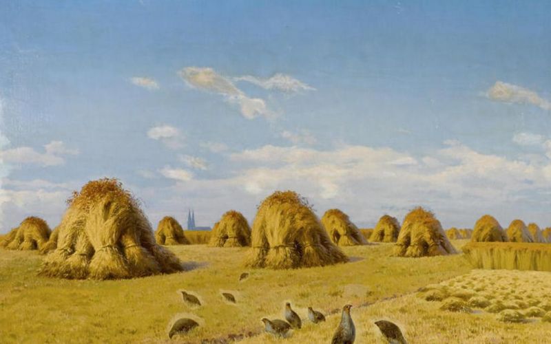 | A view of Chartres Cathedral across a hayfield with partridges in the foreground | |