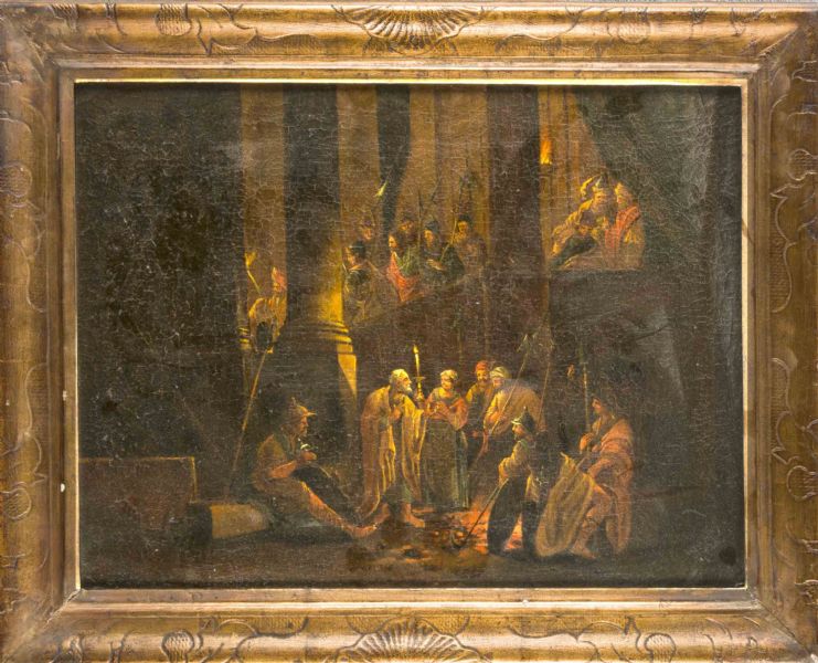 vielfigurige Szene in der Dunkelheit des Tempels, die nur von zwei Fackeln ausgeleuchtet wird