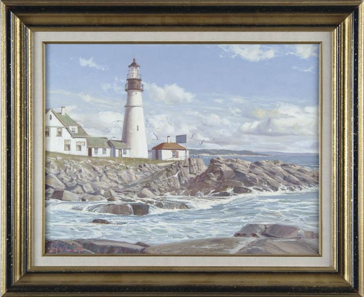 | Oil on canvas coastal scene shows a large white lighthouse with connected buildings having green roofs. It stands at the end of a rocky point with the Maine coastline beyond. Light blue sky with wispy white clouds and seagulls flying over rocks | |