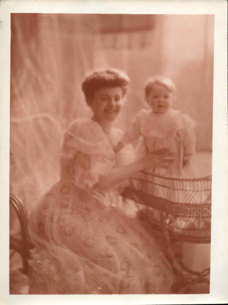 Très beau portrait de madame Misonne et de son enfant dans un lit en osier.