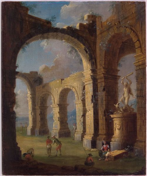 Fabbrica in rovina con scultura di Ercole che uccide il drago