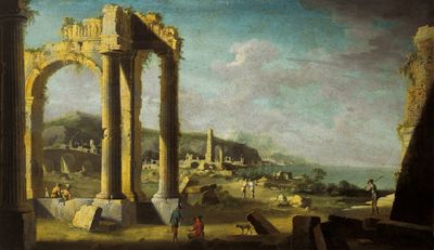 | Marina con rovine e figure / Marina with ruins and figures, siglato in basso a destra | |