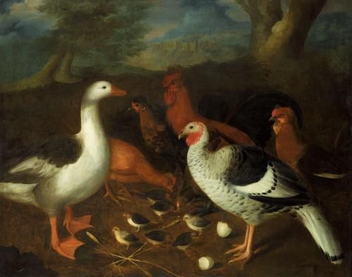 BANTAMS, A GOOSE, A TURKEY AND CHICKS IN A LANDSCAPE