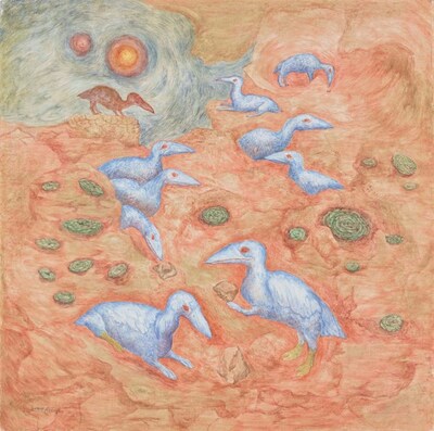signé 'Leonora Carrington’ (en bas à gauche); signé, titré, daté et situé '© LEONORA CARRINGTON NYC 1986 "DESERT DORGYS"' (au dos)
