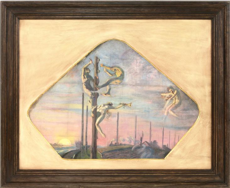 FIGURES CLIMBING ON TELEGRAPH POLES, A TRAIN IN THE DISTANCE