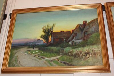 | A pair of rural views, figure with geese on a country lane, cottages alongside | |