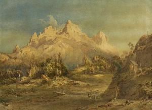 Bauernfamilie am Bildstock in Gebirgslandschaft.