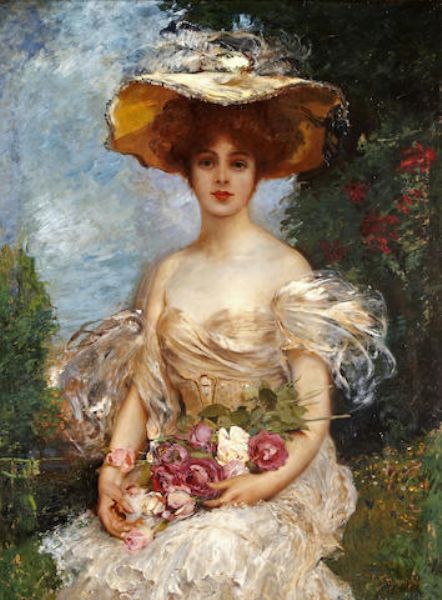 A portrait of an elegant woman seated in a garden holding a bouquet of roses