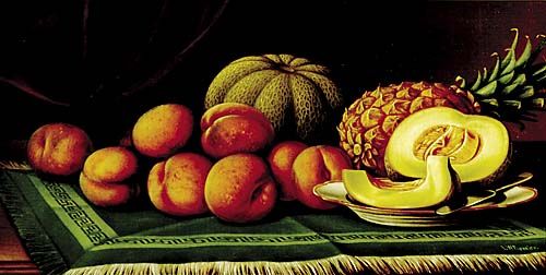 STILL LIFE OF PEACHES, CANTALOUPE AND PINEAPPLE