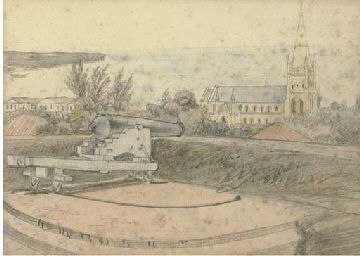 View south-west from Fort Canning, Singapore, with St. Andrew's Cathedral (1865