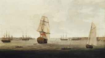| The Third Rate H.M.S. Theseus heading out of the harbour at Portsmouth | |