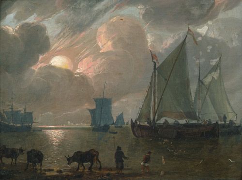 Küstenlandschaft mit Segelschiffen bei Sonnenun...