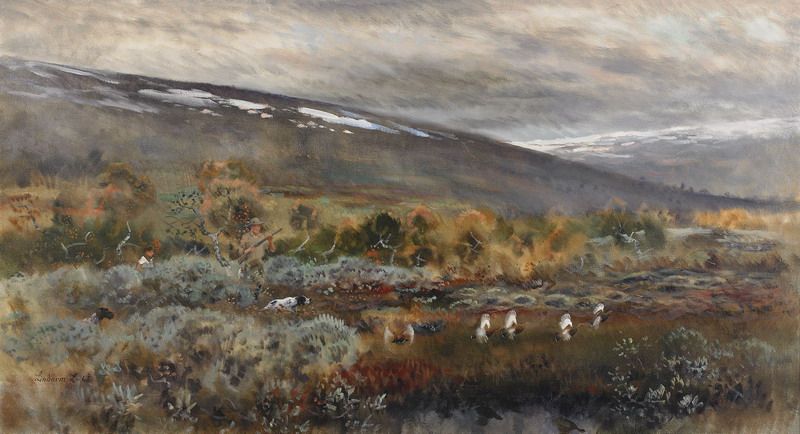 | Fjällandskap med jägare, jakthundar och dalripor | |