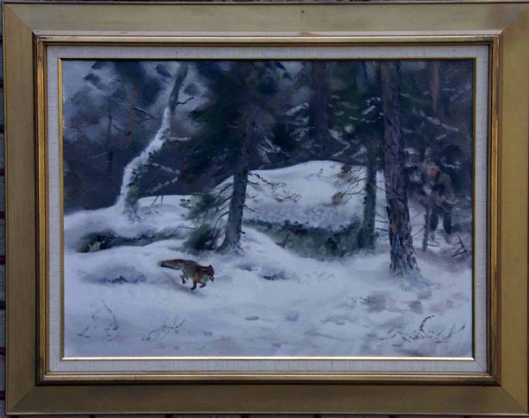 Vinterlandskap med jägare, hund och räv