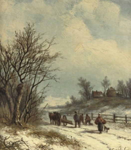 Gezigt in de omstreeken van Arnhem: wood gatherers on a snowy path near Arnhem