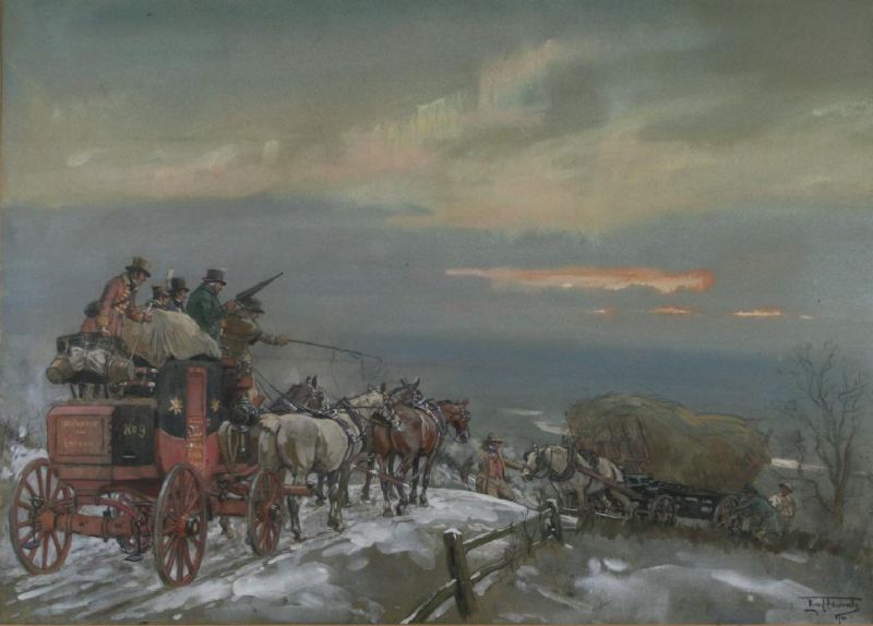 | A fully laden coach meeting a hay wain on the brow of a hill, winter scene | |