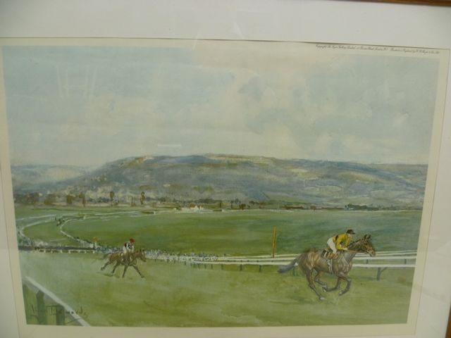 Racecourse scene at Cheltenham with horses and mounts in full gallop