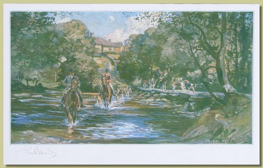 | Huntsmen and hounds crossing a ford | |