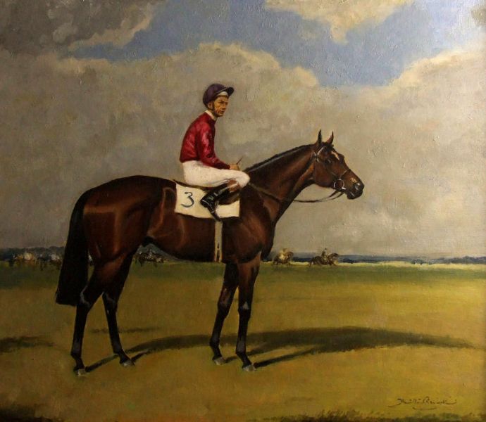 Portrait of the jockey, Lester Piggott on a bay racehorse