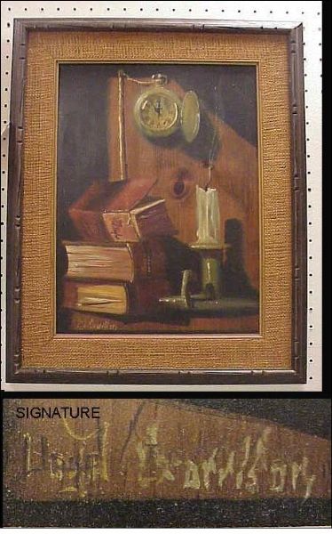 | trompe l'oeil style still life with stack of books, a candle, and a pocket watch, signed lower left twice | |