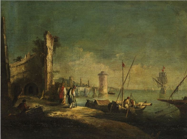 BLICK AUF EINEN HAFEN MIT RUNDTURM, RUINEN UND FIGURENSTAFFAGE