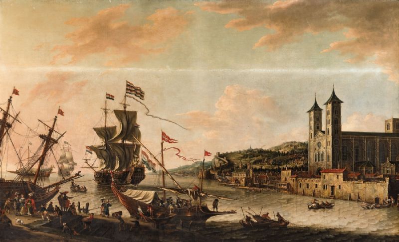 | Mediterraner Hafen mit maltesischen, spanischen und holländischen Kriegsschiffen | |
