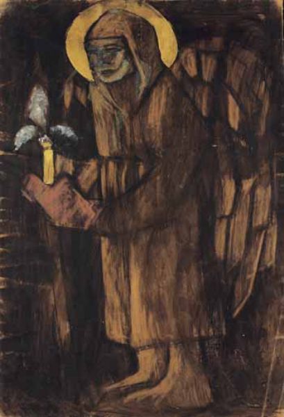 Charcoal pastel, tempera and gold on cardboard