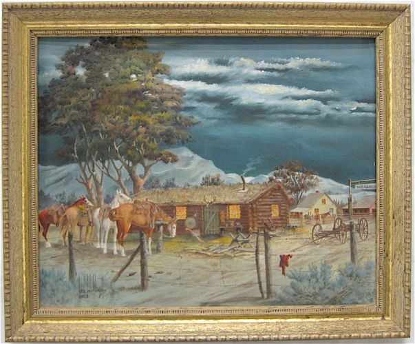 | TK Ranch and bunk house after sundown under stormy skies, saddled horses in foreground | |