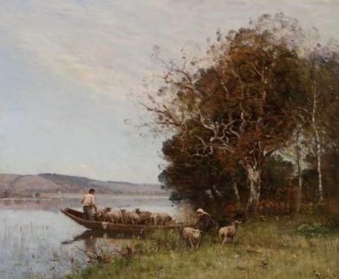 Schafhirten mit ihrer Herde in einem Kahn am Ufer