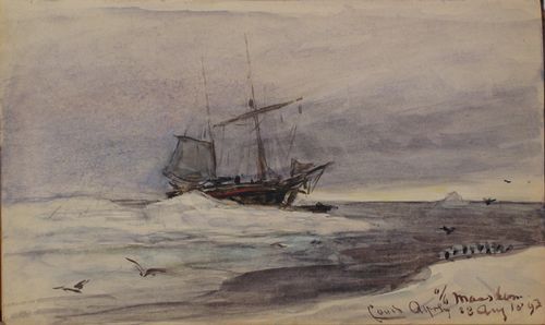| View of the Willem Barentsz at sea, surrounded by polar ice | |