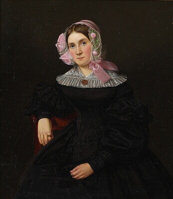 | Portrait of Mrs. Halske, née Rosenberg, wearing a black dress with a white lace collar and bonnet embellished with roses and a p | |