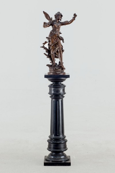 | Sculpture Calamine beautiful modernist figure. Signed at the base Louis Moreau. Casting of good quality with nice patina light brown and detailed finish. A wing welded. Columned pedestal supports on ebonised wood. 76 cm. height without base | |