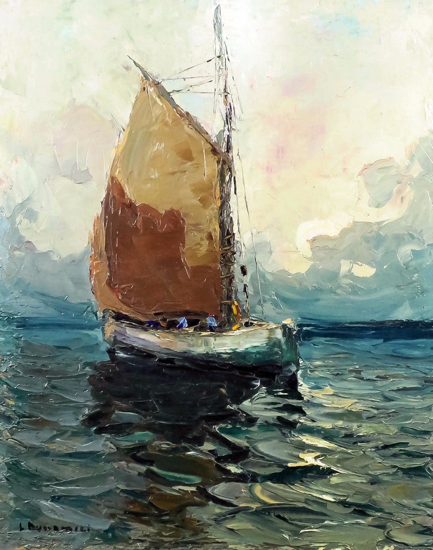 | "Voilier de Peche en Mer" - Evening with fishing boats and calm scene | |