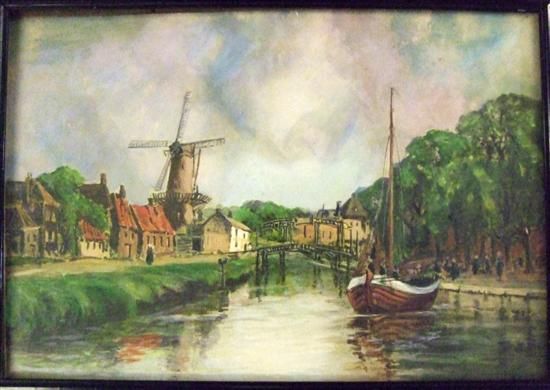 Fishing boat on a canal, with a windmill beyond
