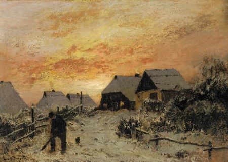 | Dorf im Winter bei Abendsonne.- Vom goldenen Schein der untergehenden Sonne beleuchtete Landschaft mit einzelnem Bauern auf Dorf | |