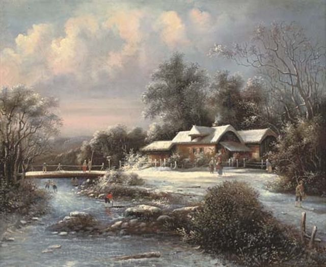 Skaters and fishermen at a bridge on a frozen river