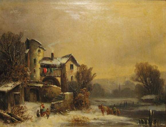 Paysans devant une ferme en hiver